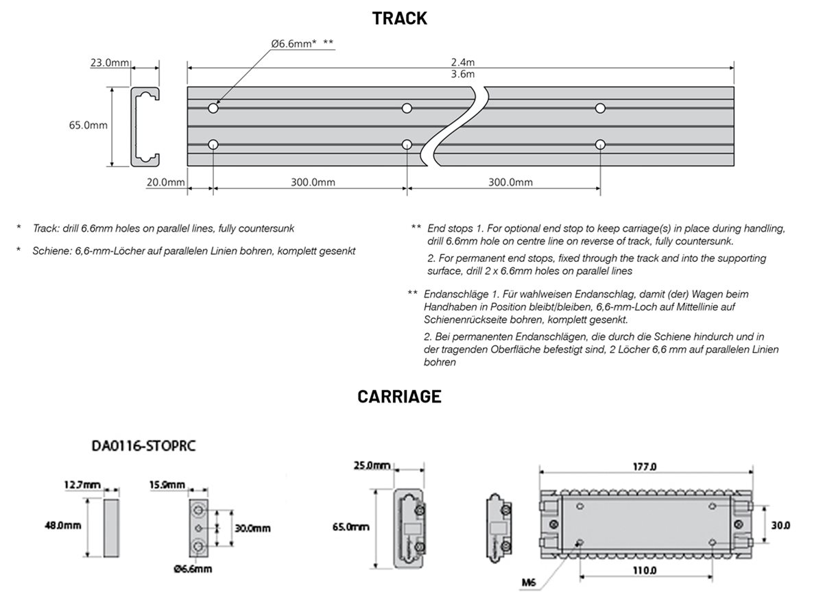 Werkstoffe - Schiene: Stranggepresstes Aluminium der Serie 6000 | Wagen: Edelstahl und Nylon