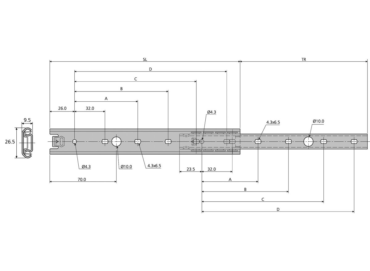 L = Load capacity of slide (kg) - per pair