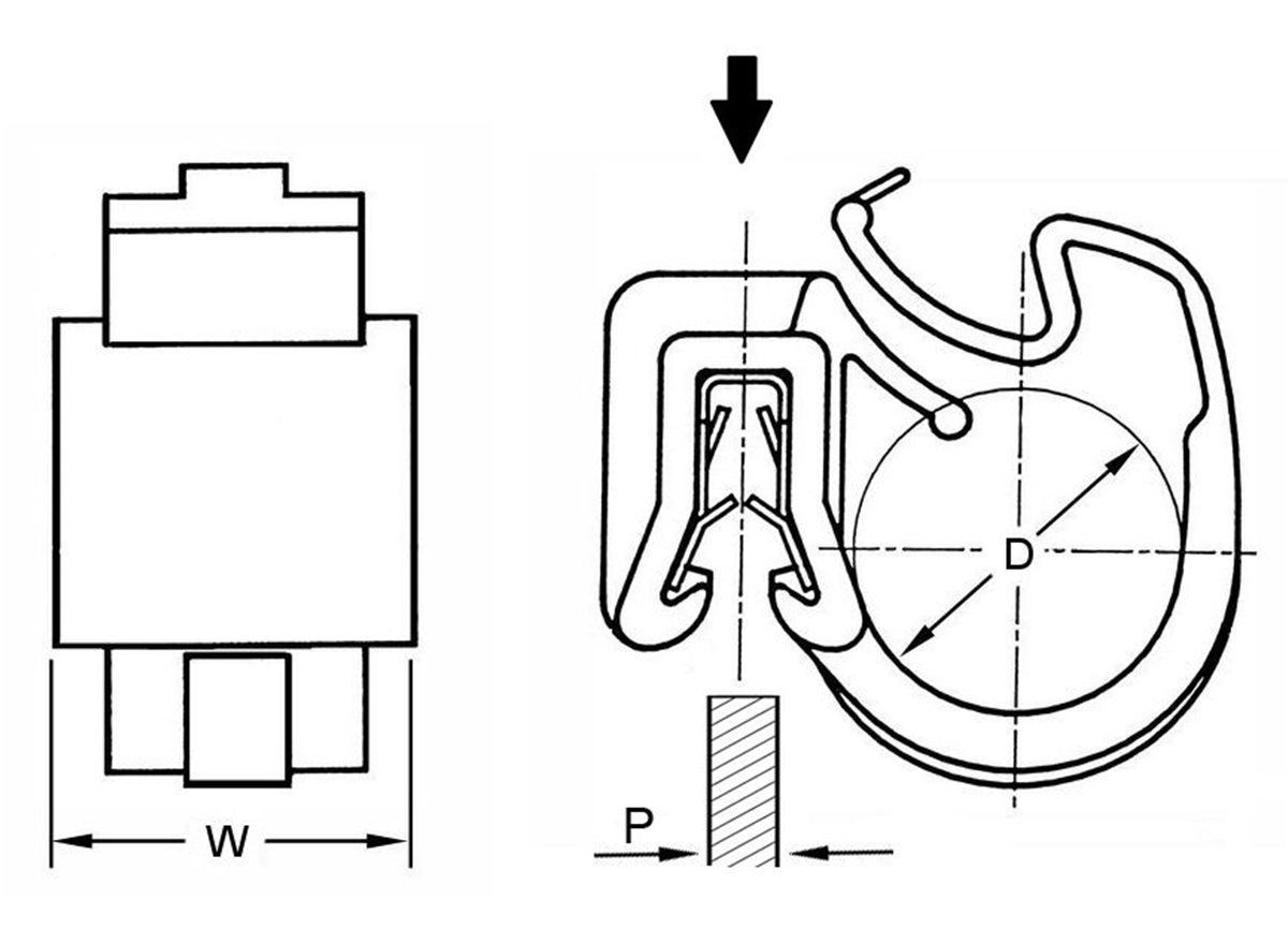 Installation requires the clip to be tapped onto the panel edge. No special tools are needed. The arms of the clip hold the cable or pipe safely in place.