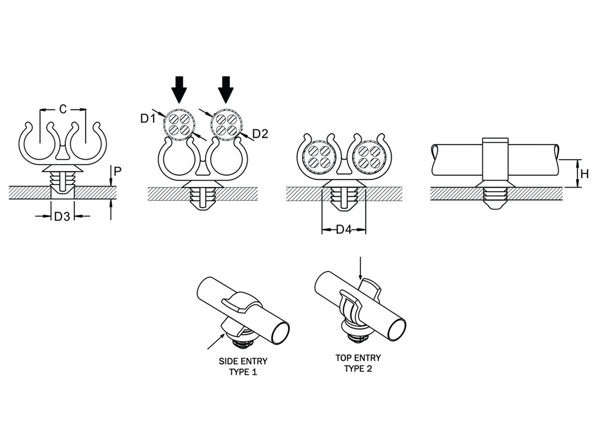 These Double Fir Tree Cable Clips or pipe clip fasteners are suitable for various applications where a combination of cables or pipes need securing to each other. The fir tree nose-form on these clips enables them to be inserted into a wide range of panel thicknesses.