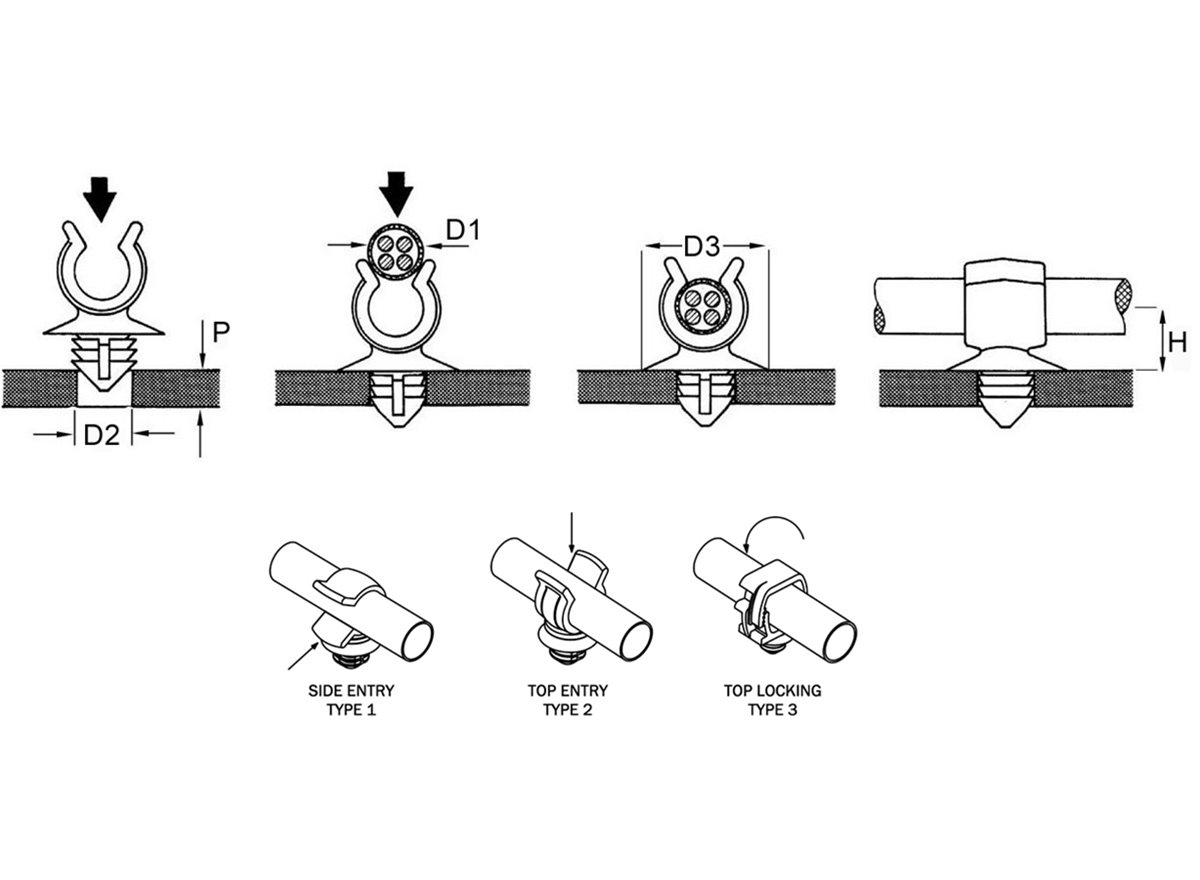 Es gibt zwei Varianten, der Clip ist entweder zur Seite oder nach oben geöffnet. Die oben offene Klemme ist zudem mit einer Verriegelung erhältlich, um das Kabel oder Rohr vibrationssicher zu befestigen.