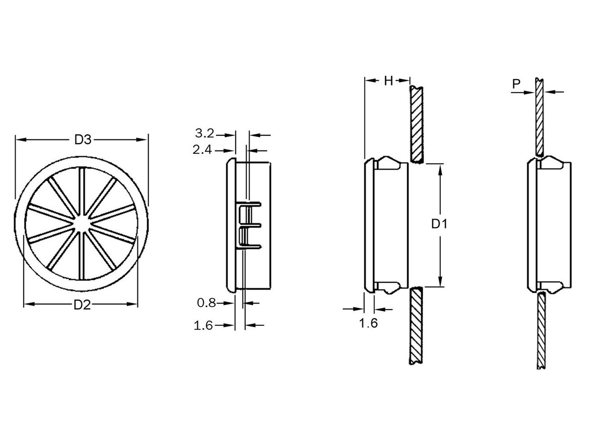 Diese Kabeldurchführung schützt Drähte, Kabel, Rohre und Schläuche vor scharfkantigen oder uneben gebohrten Löchern in Metall. Sie absorbiert Vibrationen und passt sich dem jeweiligen Durchmesser und Form der Anwendung an. In unserer Tabelle zeigen P und D2 die jeweiligen maximalen Paneelstärken und Bündeldurchmesser an. Wir haben außerdem original Heyco Snap-in Kabeldurchführungen - Geschlitzt im Angebot Typische Anwendungen: Haushaltsgeräte, Kraftfahrzeuge Werkstoff - Nylon Standardfarbe - Schwarz