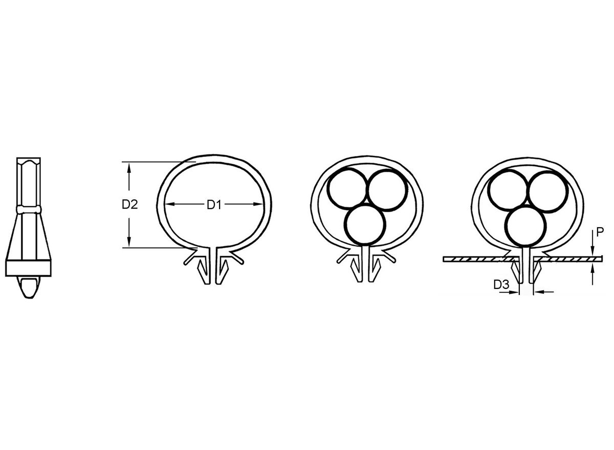 Diese einfach zu installierenden Omega-Schellen werden um ein Kabel oder Kabelbündel gewickelt und halten das Bündel am Platz, sobald der Stopfen in das vorgebohrte Loch gesteckt wird.