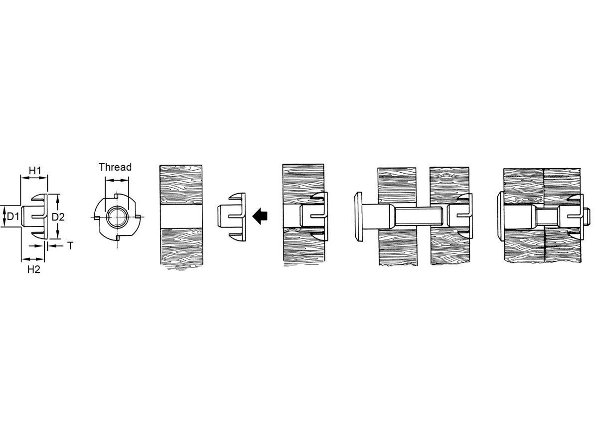 These pronged T-Nuts provide a strong, reliable anchor for wood and plastic. Pronged Tee Nuts are inserted into a pre-drilled hole and tapped into place. They are flush-fitting, so no counter boring is required. A self-locking feature prevents rotation during hand or automatic assembly.