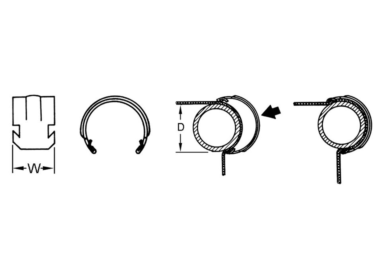 Diese Rohrklemmen, zur Befestigung von Sitzbezügen oder anderen Stoffen an Rohrstangen, lassen sich einfach anbringen: Der Stoff wird um das Rohr gezogen, und durch das Aufstecken der Klemmen in Position gehalten. Typische Anwendungen: Fahrzeugsitzbezüge Werkstoff - Federstahl