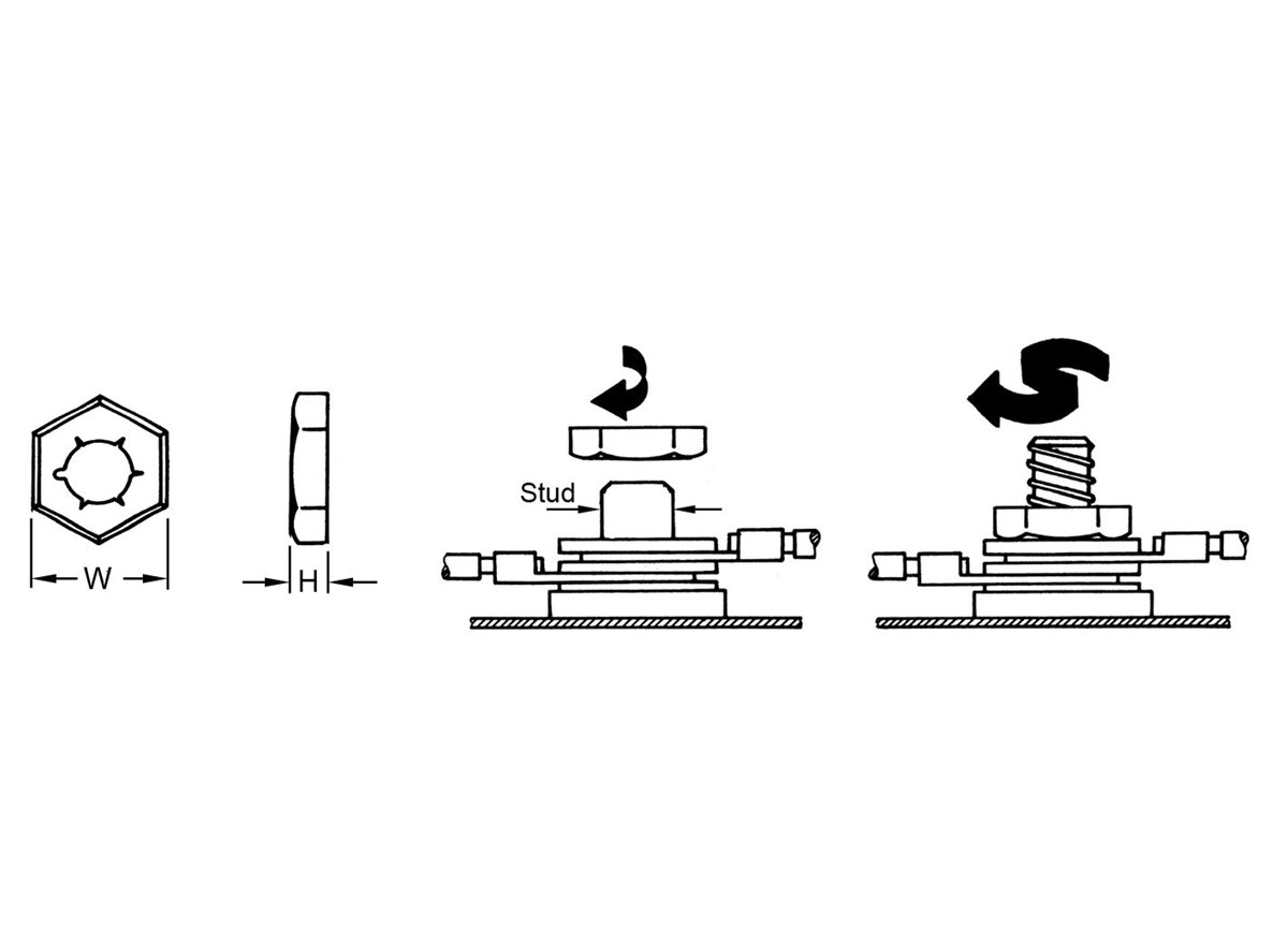 These Self-Threading Nuts form their own thread on plastic, die cast or mild steel studs. The thread-forming displaces material without producing swarf. They are removable and reusable. Self Threading Nuts have a low height and small exterior dimensions so they are ideal where space is restricted. Where there is insufficient clearance for standard tools, a special internal hex wrench can be used.