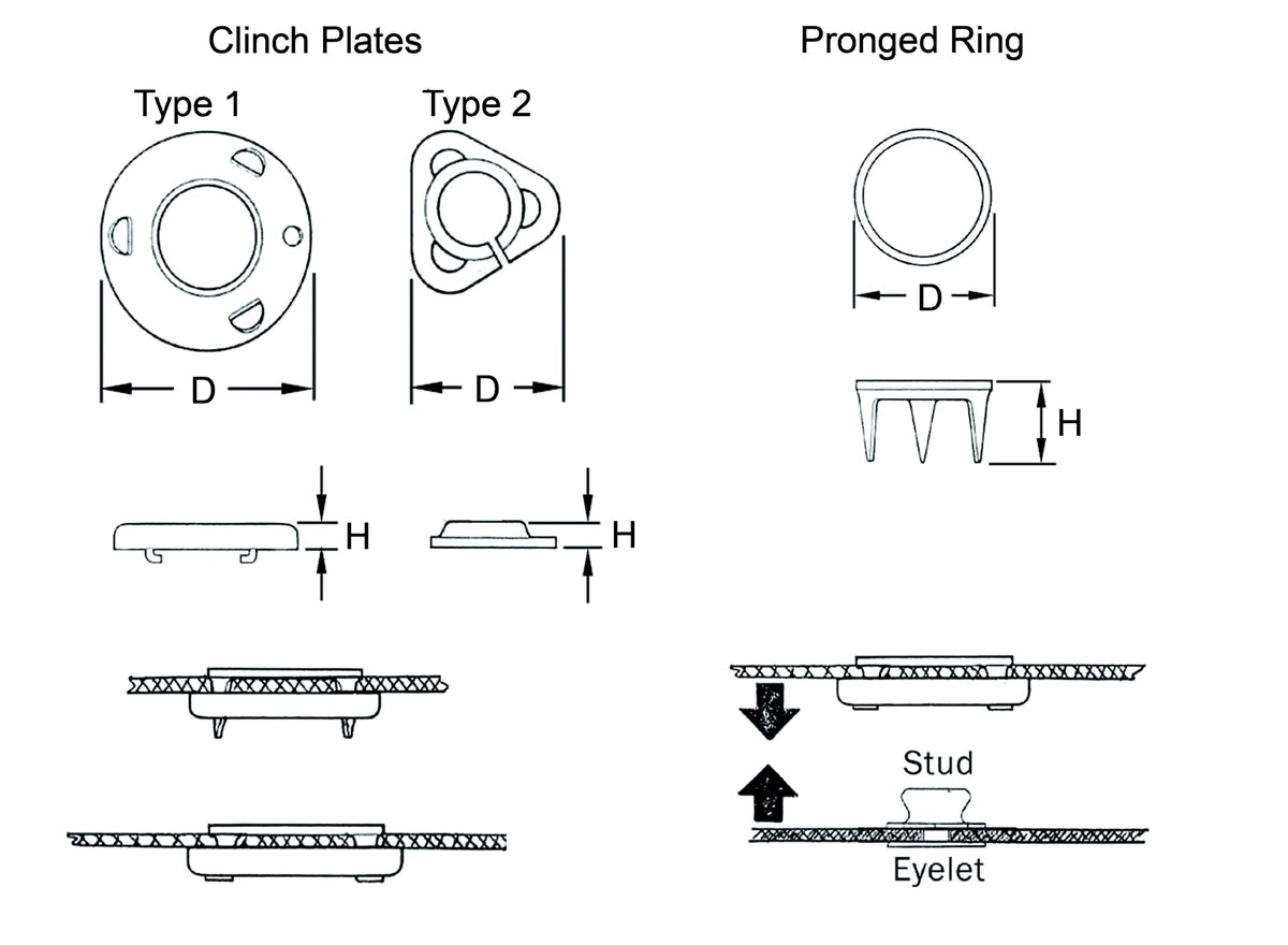 Ring und Klemmplatte werden an dem zu befestigendem Material angebracht und bilden den Sockel, welcher auf einem in den Untergrund befestigten Druckknopf gedrückt wird. Ring und Klemmplatte sind als Typ 1 oder Typ 2 erhältlich und passen auf einen beliebigen Druckknopf der richtigen Größe. Die Verbindung kann jeder Zeit wieder gelöst werden.