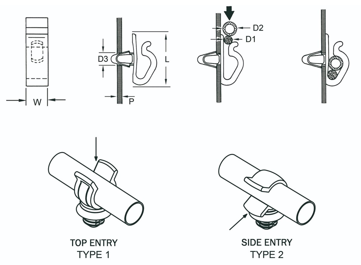 This range of Multi W Button Cable Clips is designed to be pushed into pre-punched or drilled holes. They will hold cables and pipes securely. Pipe entry orientation options are available as shown.