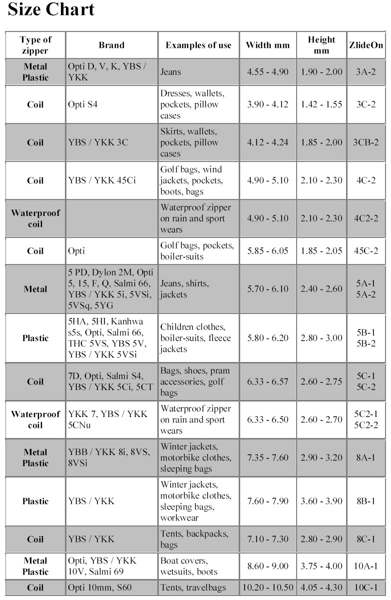 To find a suitable zipper, measure the width and the height of your old zipper and then use the size chart below to decide what size and type you need. ZlideOn is available for all types of zip fasteners in different colours and sizes.
